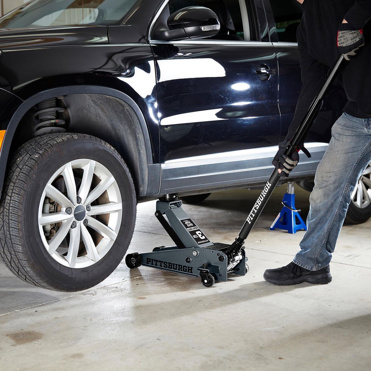2025 PITTSBURGH Gato hidráulico de piso de perfil bajo de 3 toneladas con bomba RAPID PUMP. color gris pizarra