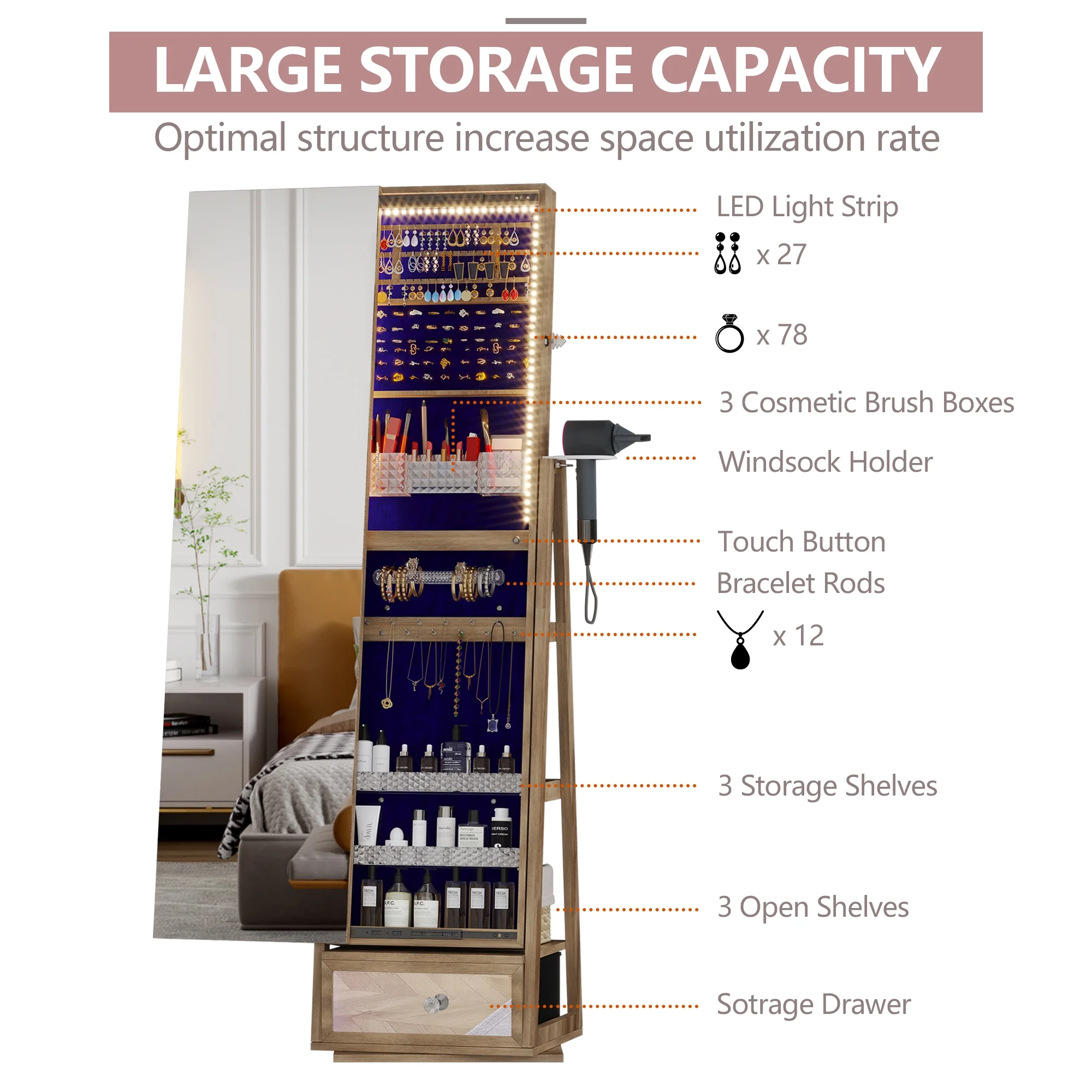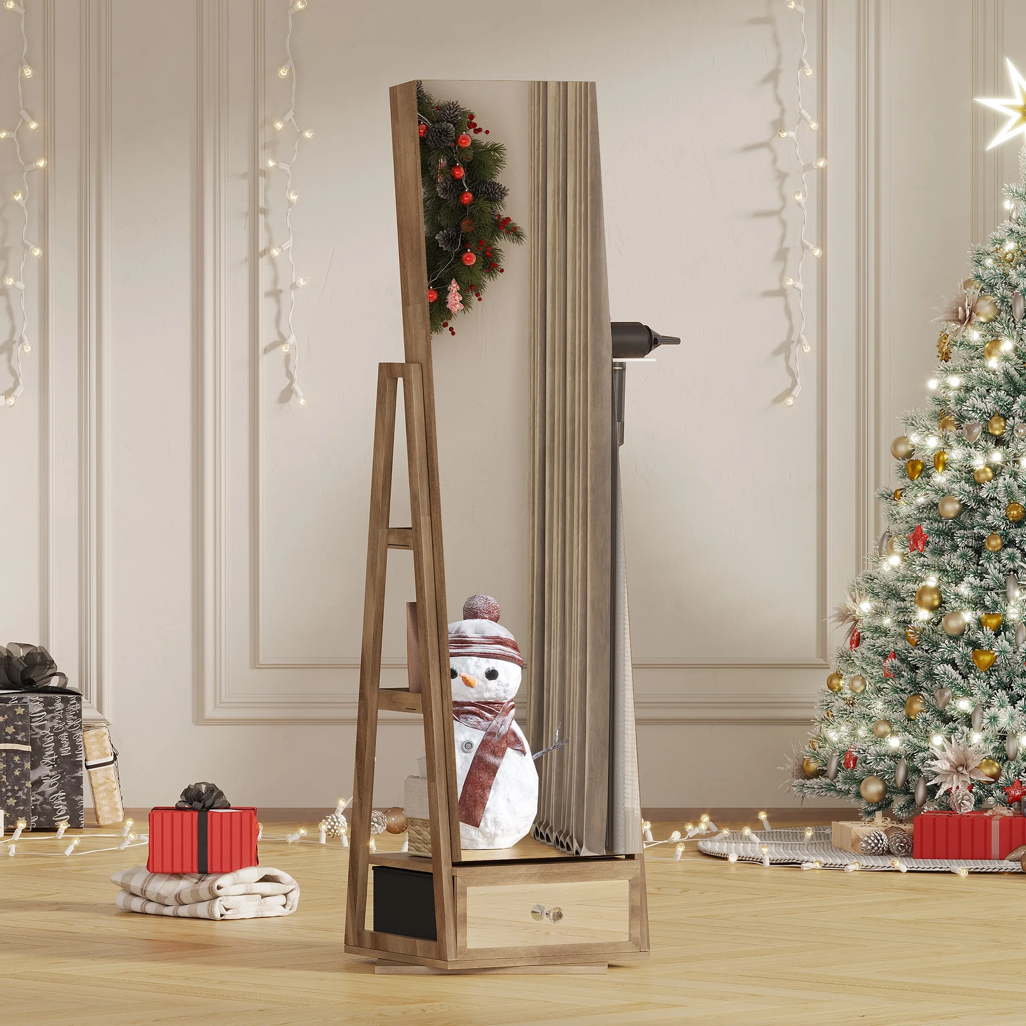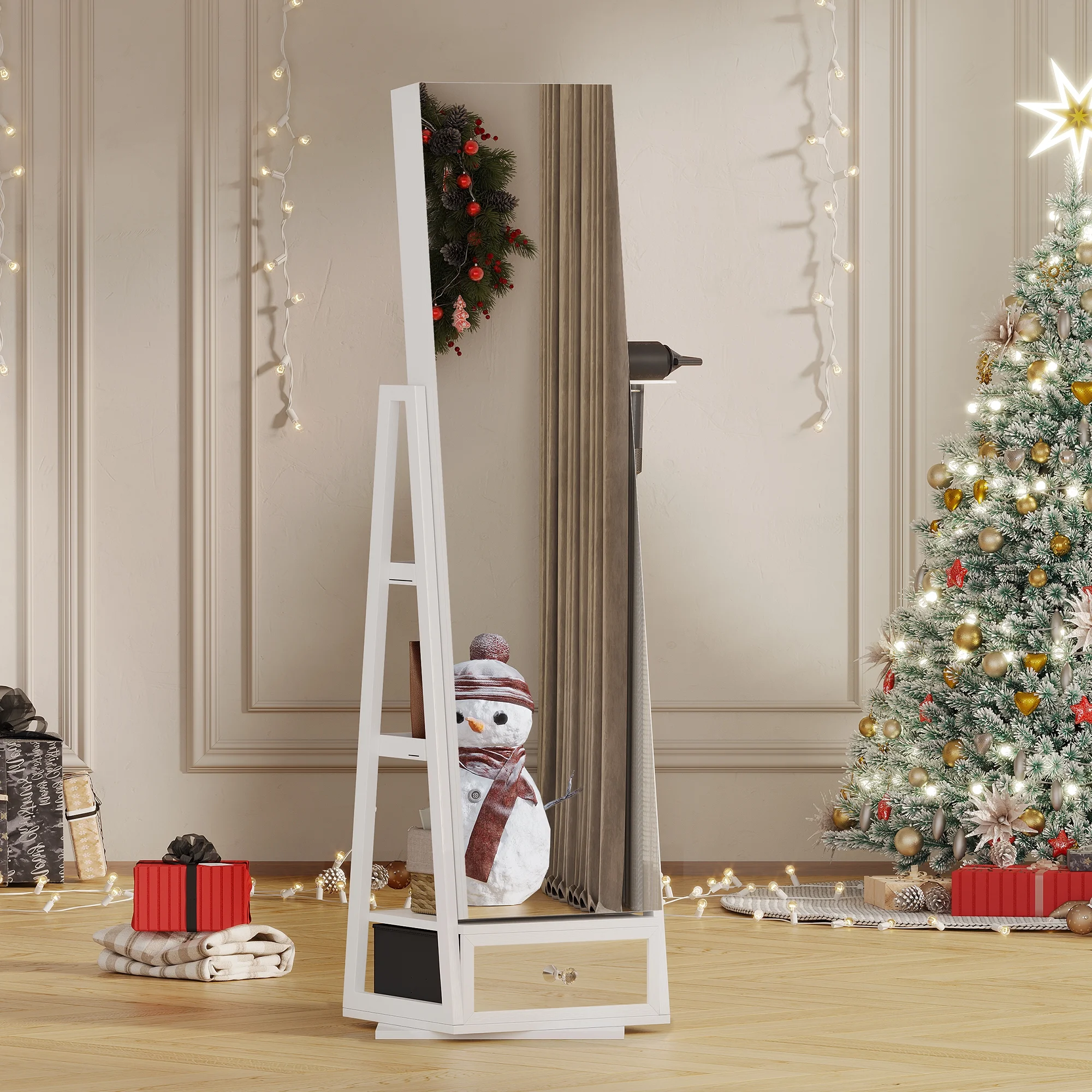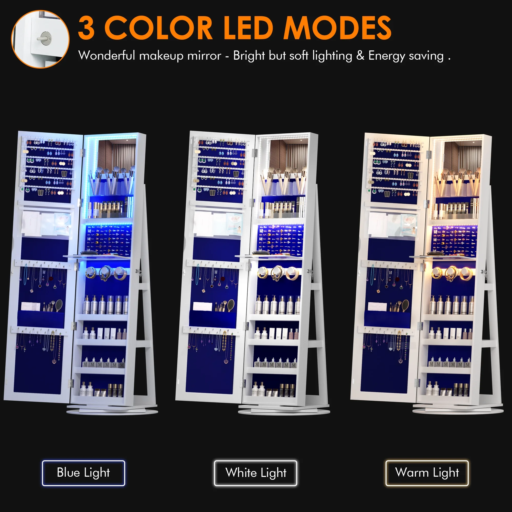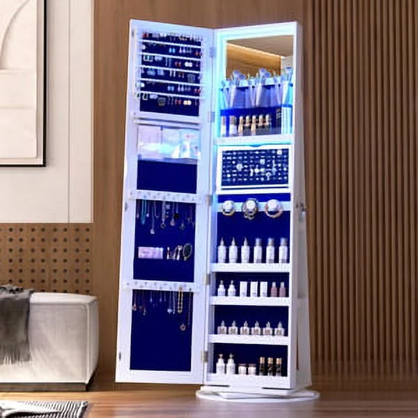 Joyero giratorio LVSOMT con luz LED y espejo de cuerpo entero: almacenamiento elegante de 360°