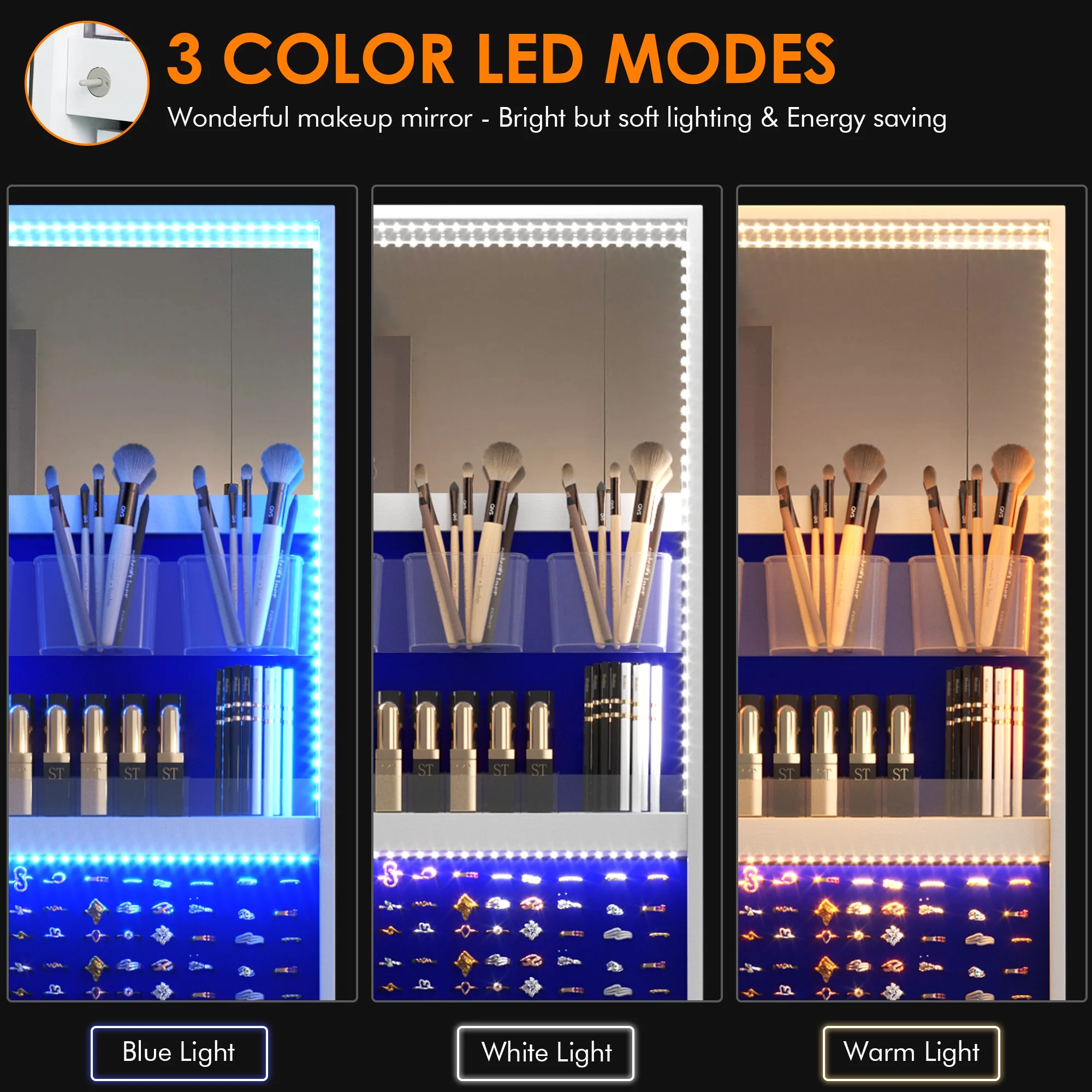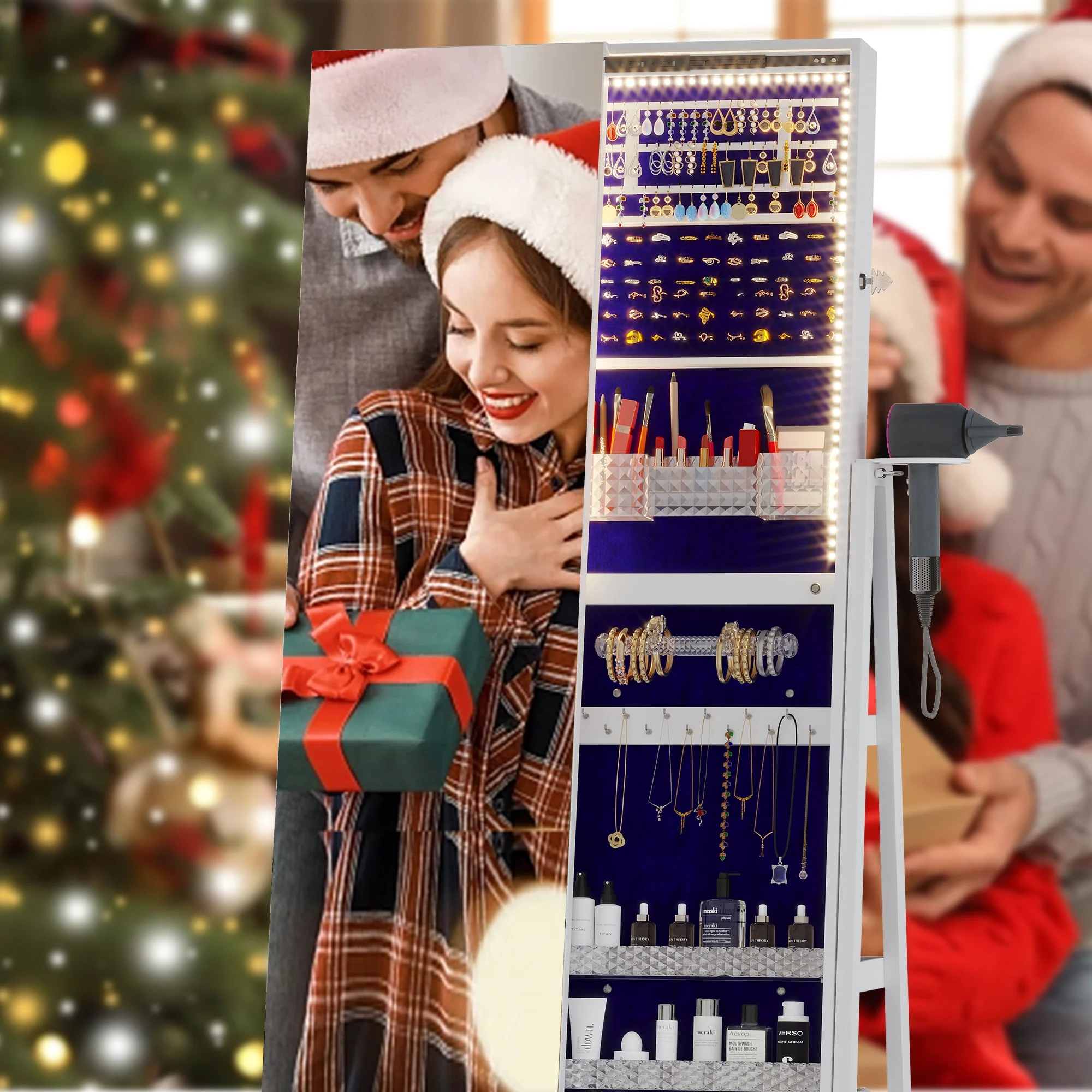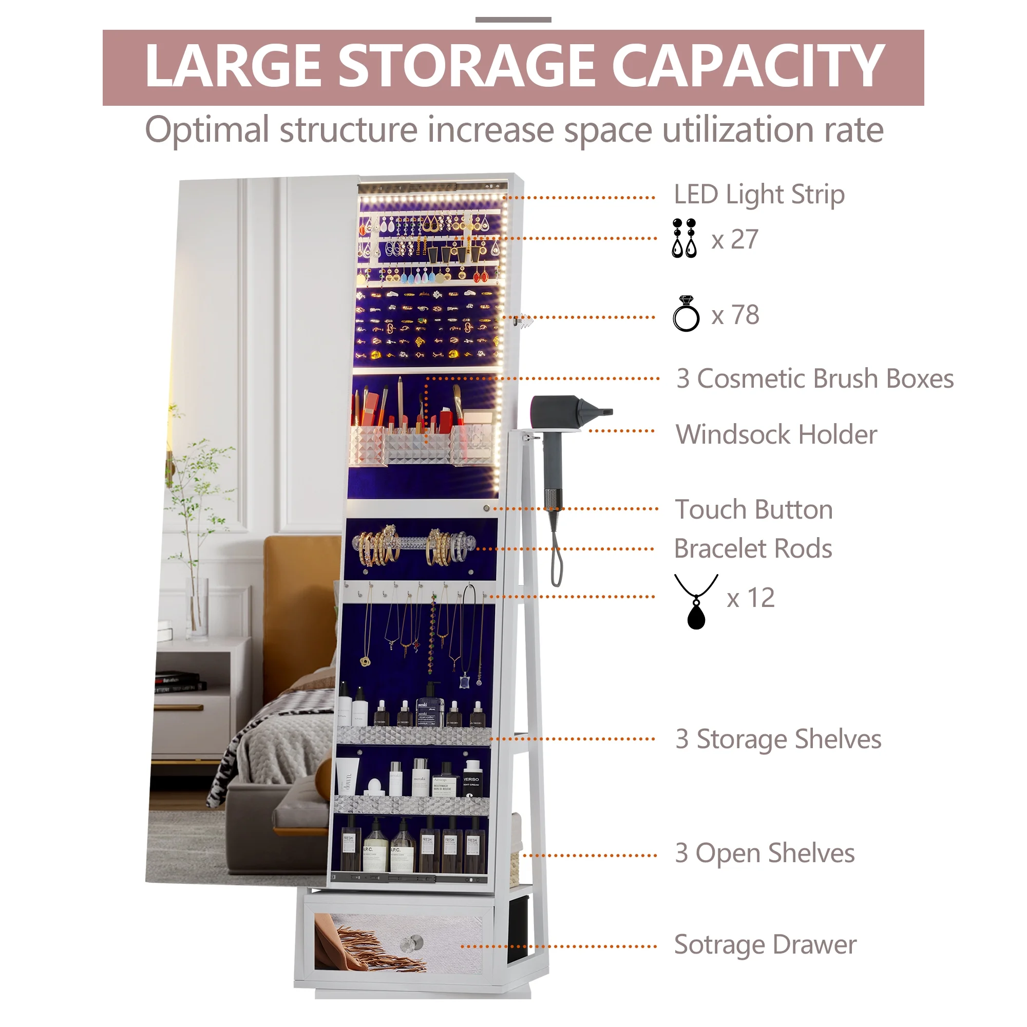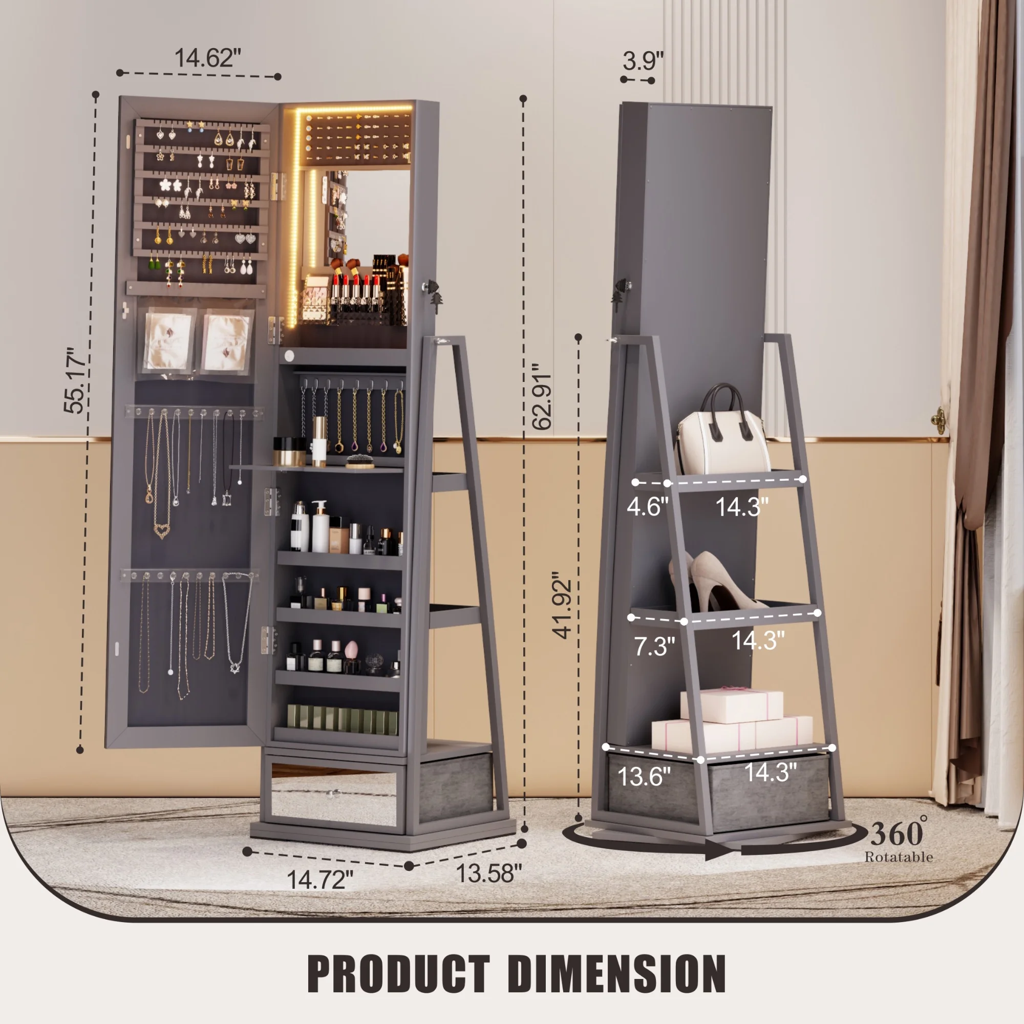 Joyero giratorio LVSOMT con luz LED y espejo de cuerpo entero: almacenamiento elegante de 360°