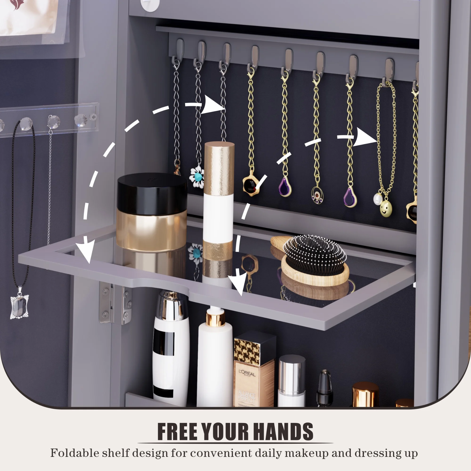 Joyero FREDEES con espejo e iluminación: organizador de madera con espejo de cuerpo entero para mujer. color gris elegante.