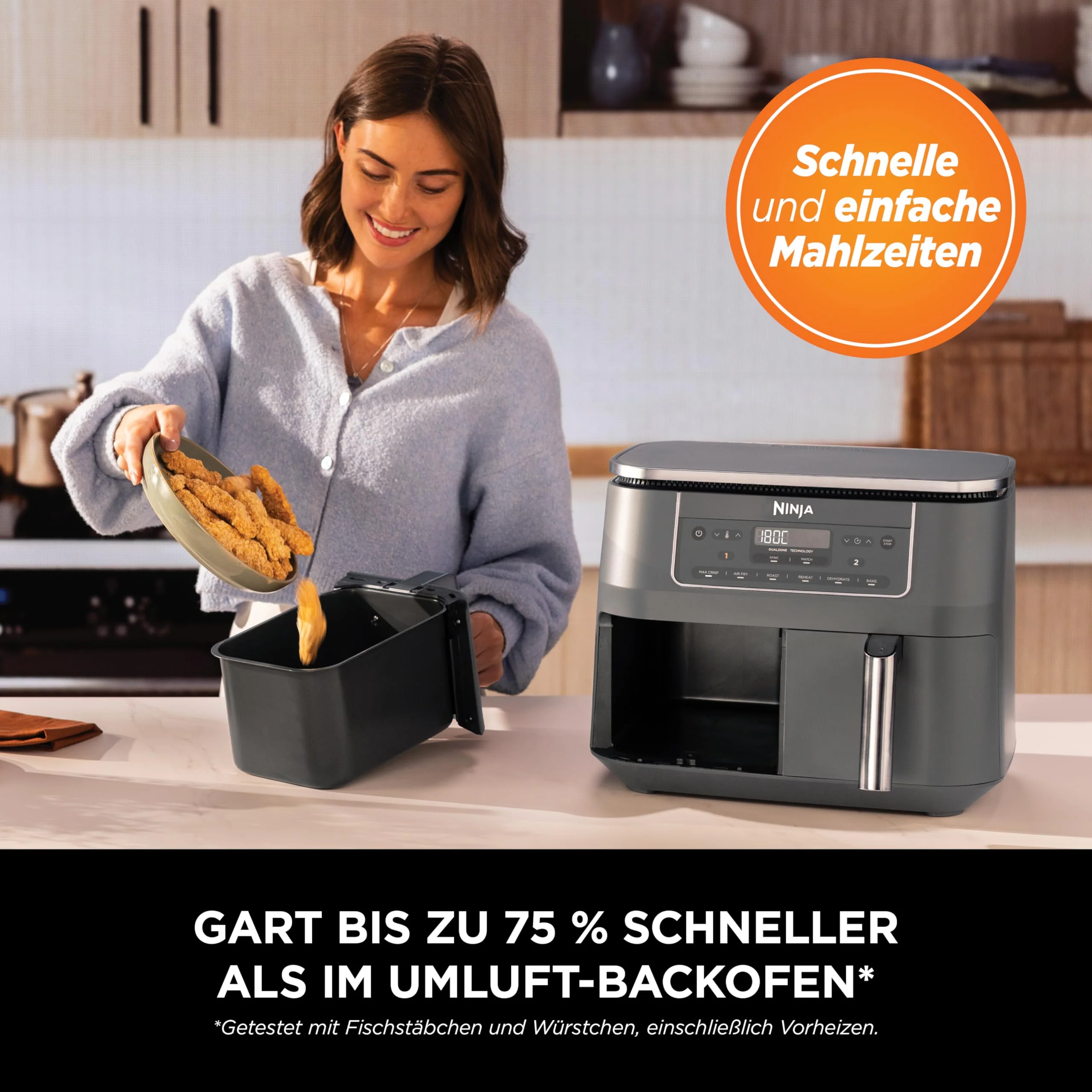 2025 Freidora de aire digital Ninja Dual Zone, 2 cajones, 6 en 1, sin aceite, capacidad 7,6 L, cocción con aire caliente, función Max Crisp, asar, hornear, recalentar, cestas aptas para lavavajillas, gris metálico DZ300EU