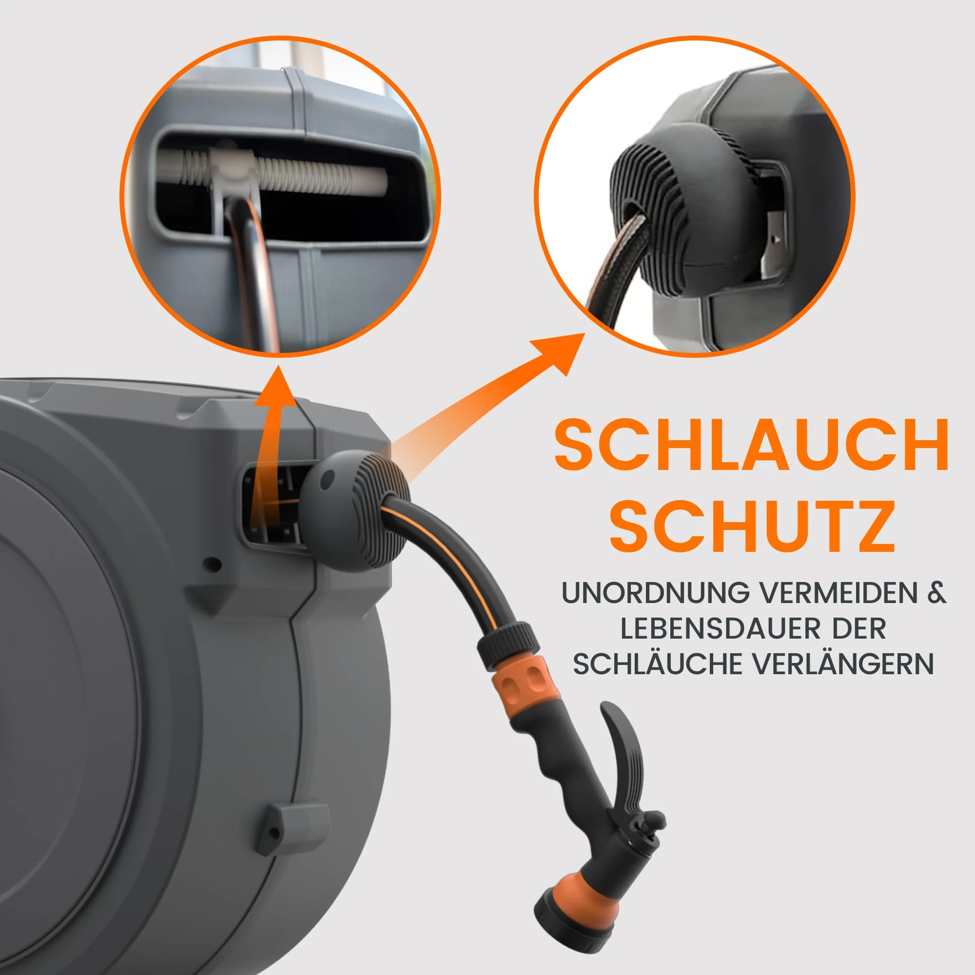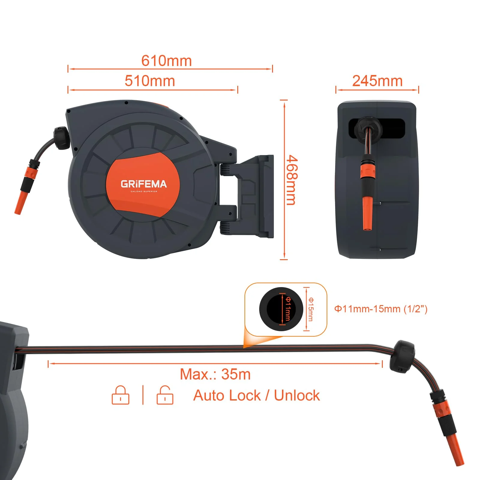 2025 GRIFEMA G301-35 Carrete de manguera mural con manguera de 35 m + 2 m, caja giratoria 180°, enrollado automático con boquilla ajustable