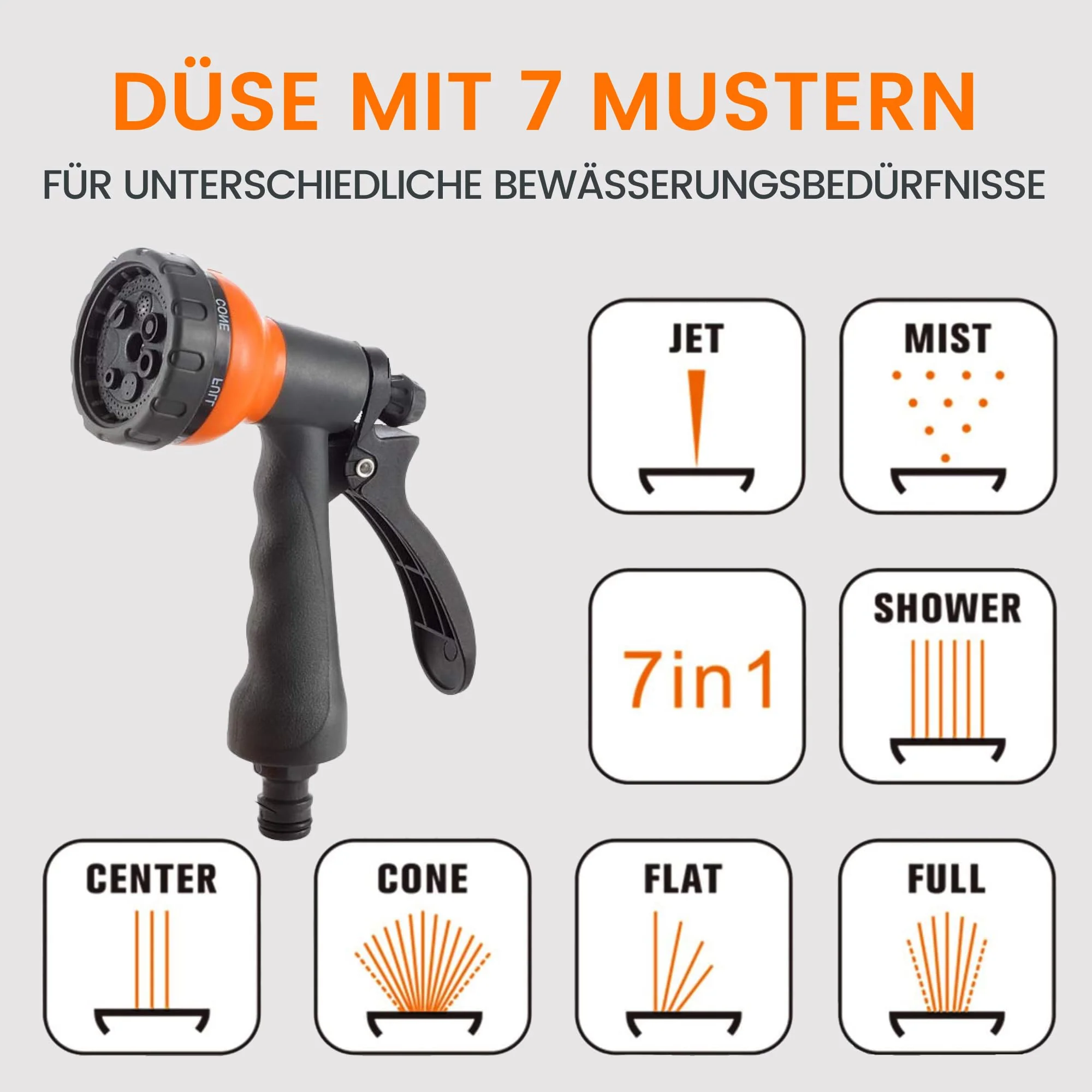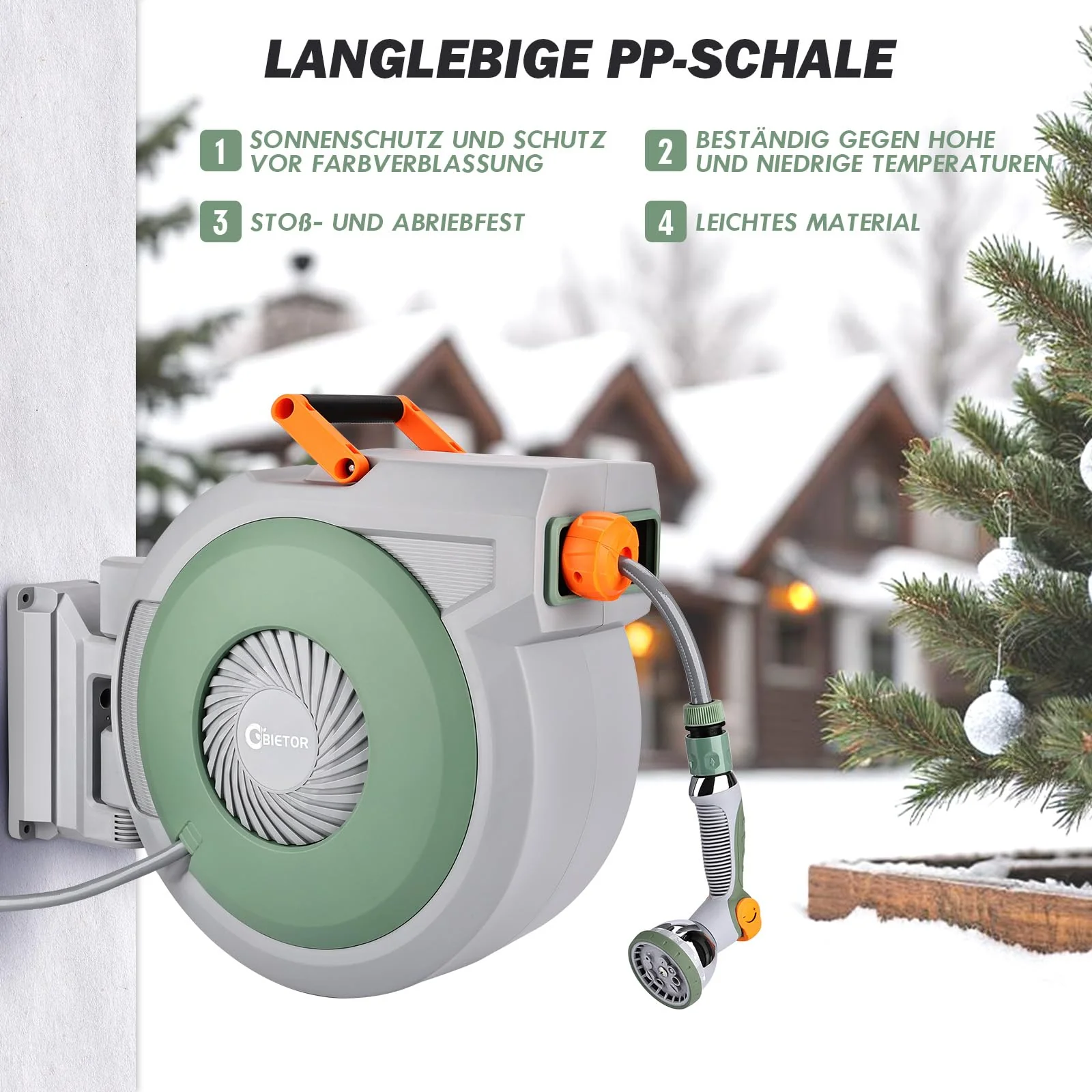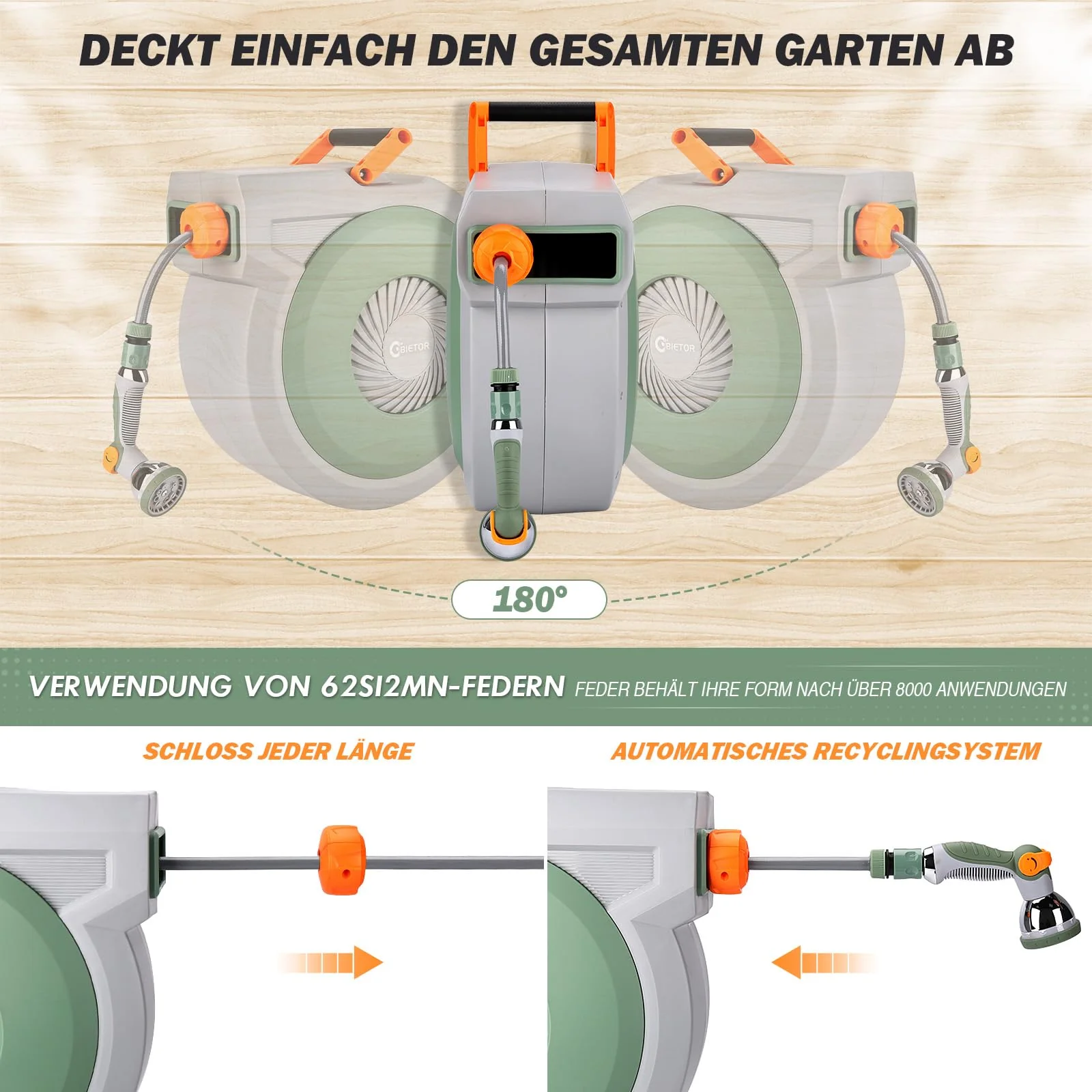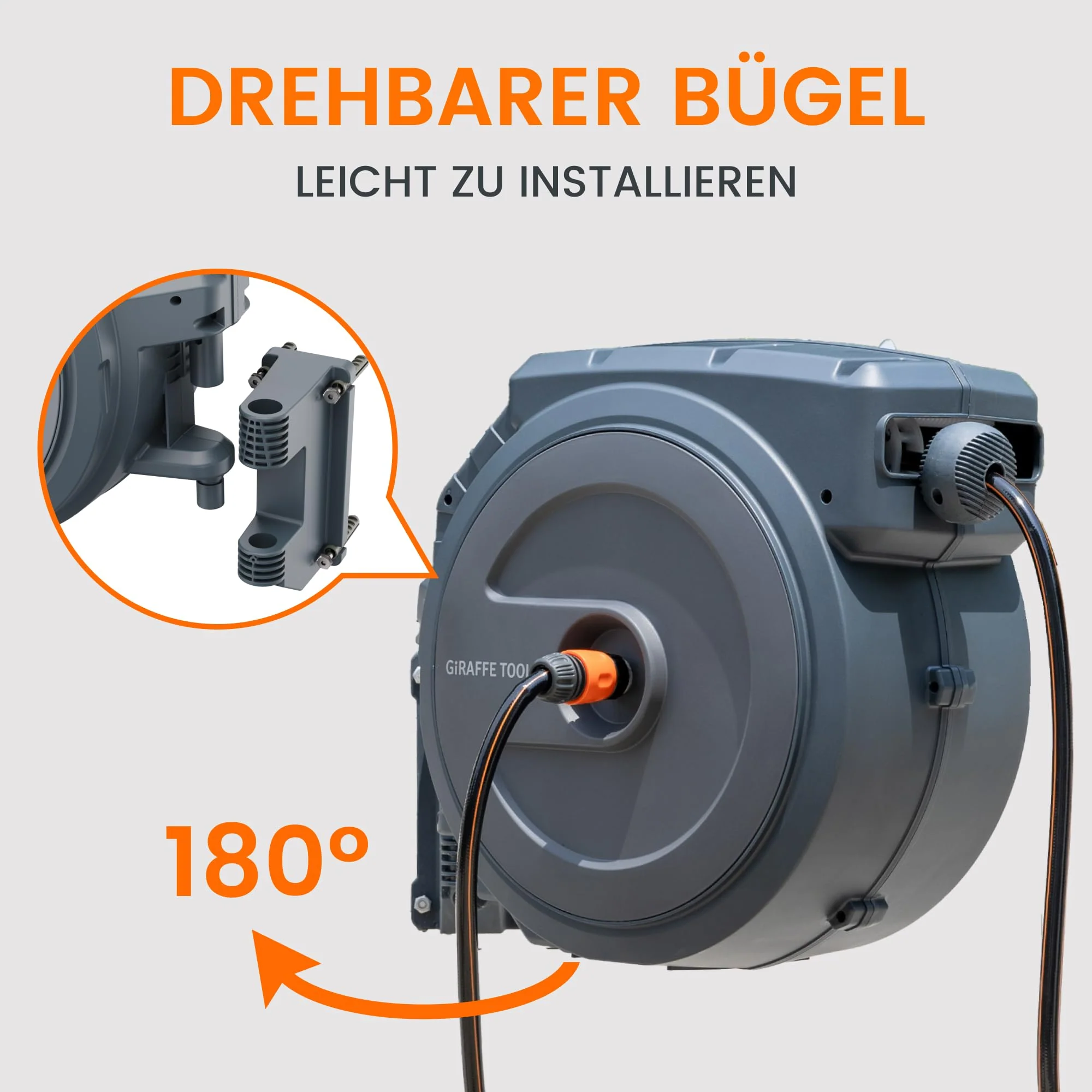 2025 Caja de Manguera de Pared Automática Giraffe Tools 35 m + 2 m, Enrollador de Manguera Giratorio 180°, con 7 Boquillas Ajustables y Manguera de Conexión